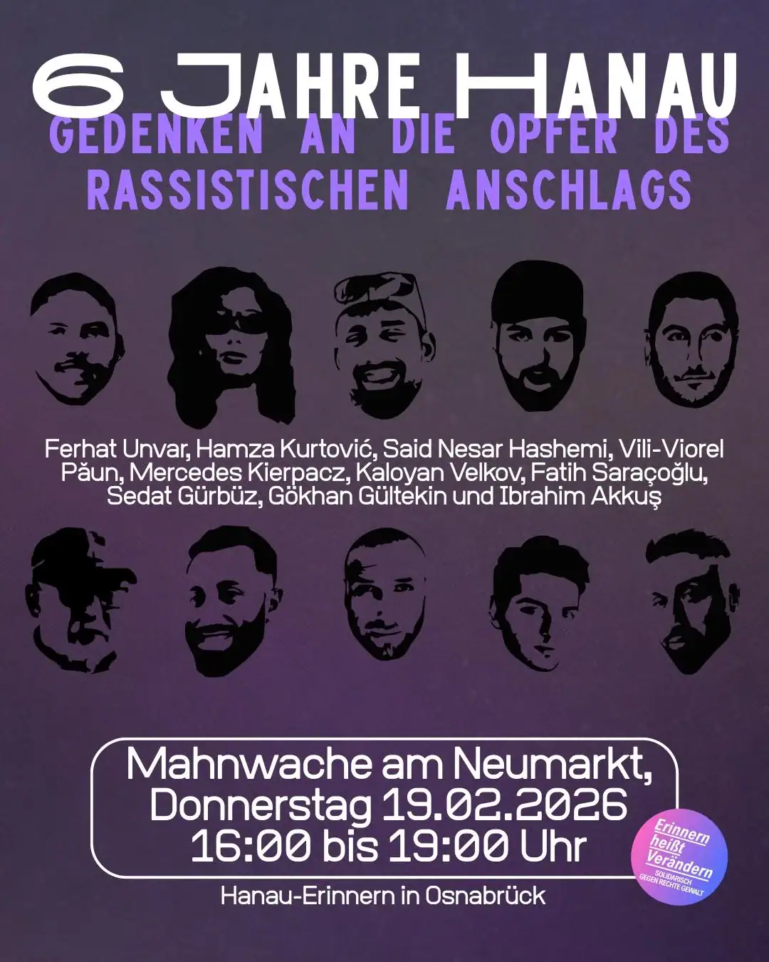 Sechs Jahre nach den rassistischen Morden in Hanau werden wir den zehn Opfern gedenken. Hier in Osnabrück rufen wir dieses Jahr zu einer Mahnwache auf: