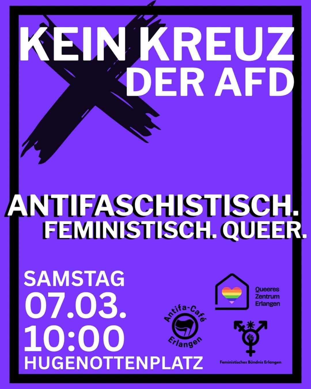 Am 7.3., dem Tag vor dem internationalen feministischen Kampftag und der Erlanger Kommunalwahl, rufen wir im Namen des Antifa-Cafés, des Queeren Zentrums und des feministischen Bündnisses dazu auf, sich uns anzuschließen, wenn wir laut und deutlich fordern: