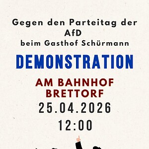 Wir rufen zur Demonstration gegen die Neugründung der Jugendorganisation der AfD beim Gasthof Schürmann in Brettorf auf. Der Demonstrationszug führt vom Bahnhof Brettorf zum „Im großen Ort“, dort findet eine Zwischenkundgebung statt. Abschließende Worte beenden die Demonstration am Bahnhof.