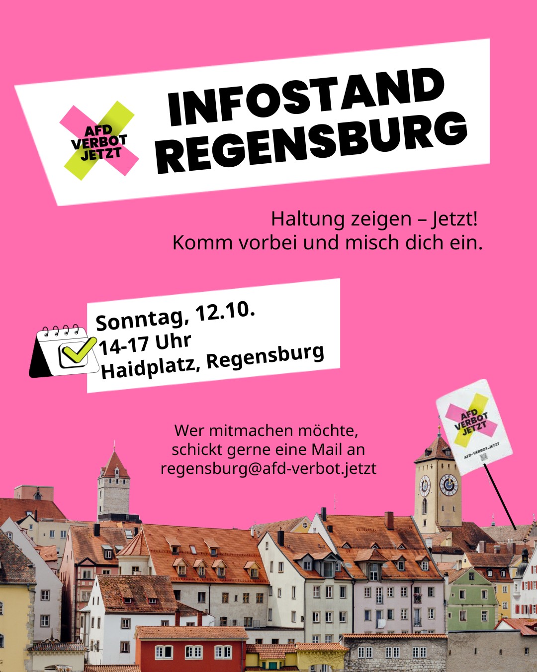 Besucher*innen können mit uns ins Gespräch kommen, Infomaterial mitnehmen und die Petition für ein AfD-Verbot an den Bayerischen Landtag direkt vor Ort unterschreiben. Gemeinsam setzen wir ein Zeichen für Demokratie und Menschenwürde in Regensburg.