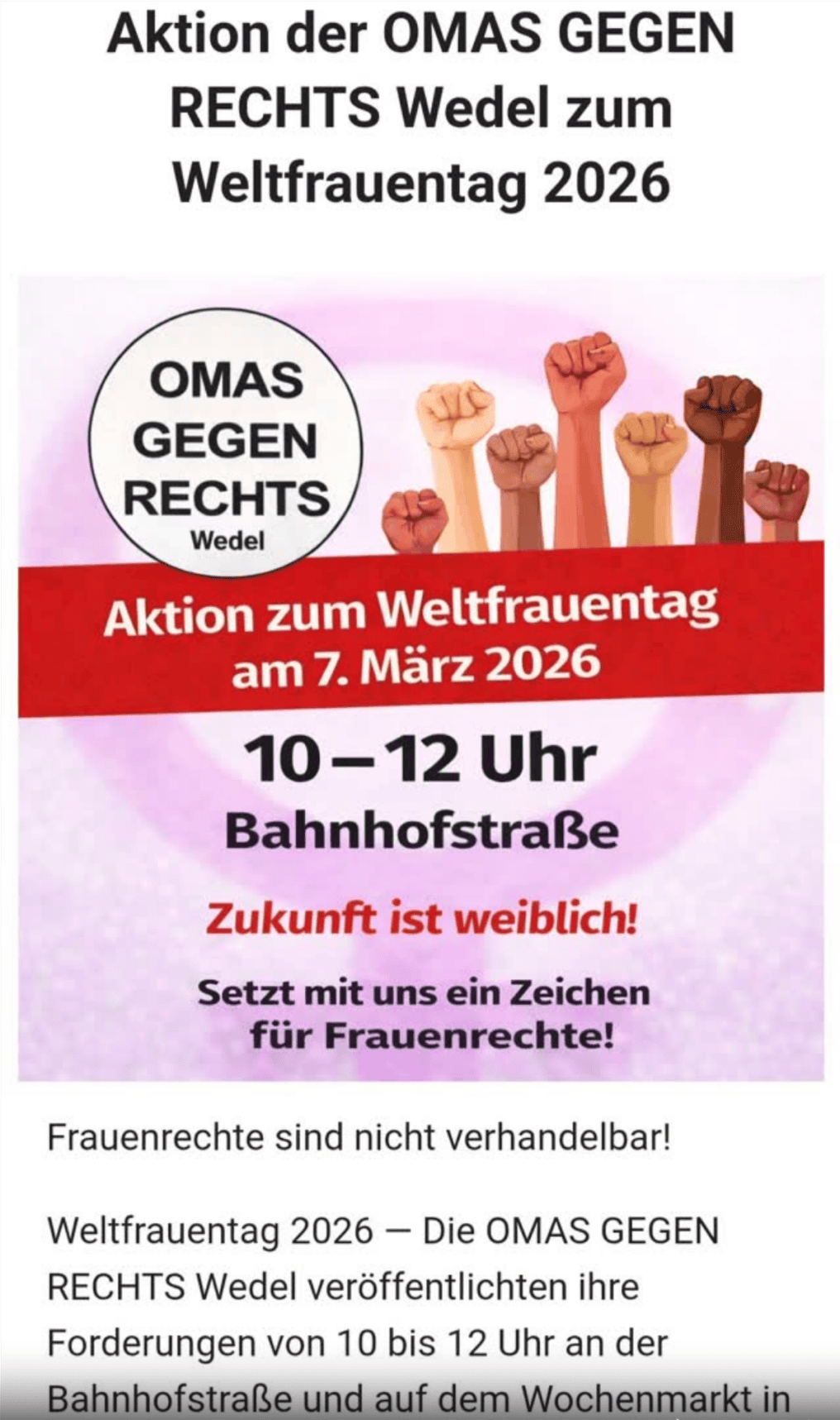 Die Omas Gegen Rechts Wedel starten im Rahmen des Weltfrauentages eine Aktion von 10-12 Uhr.