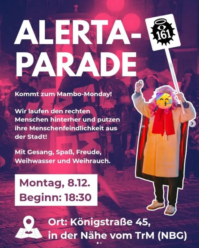 Diesen Montag reinigen wir die Stadt abermals von der blau-braunen Hetze des “Teams rechter Menschen” indem wir ihrem Demozug hinterherlaufen und dabei zu antifaschistischen Mamboklägen tanzen und singen. Schließ dich dem Alerta-Mambo-Montag an!