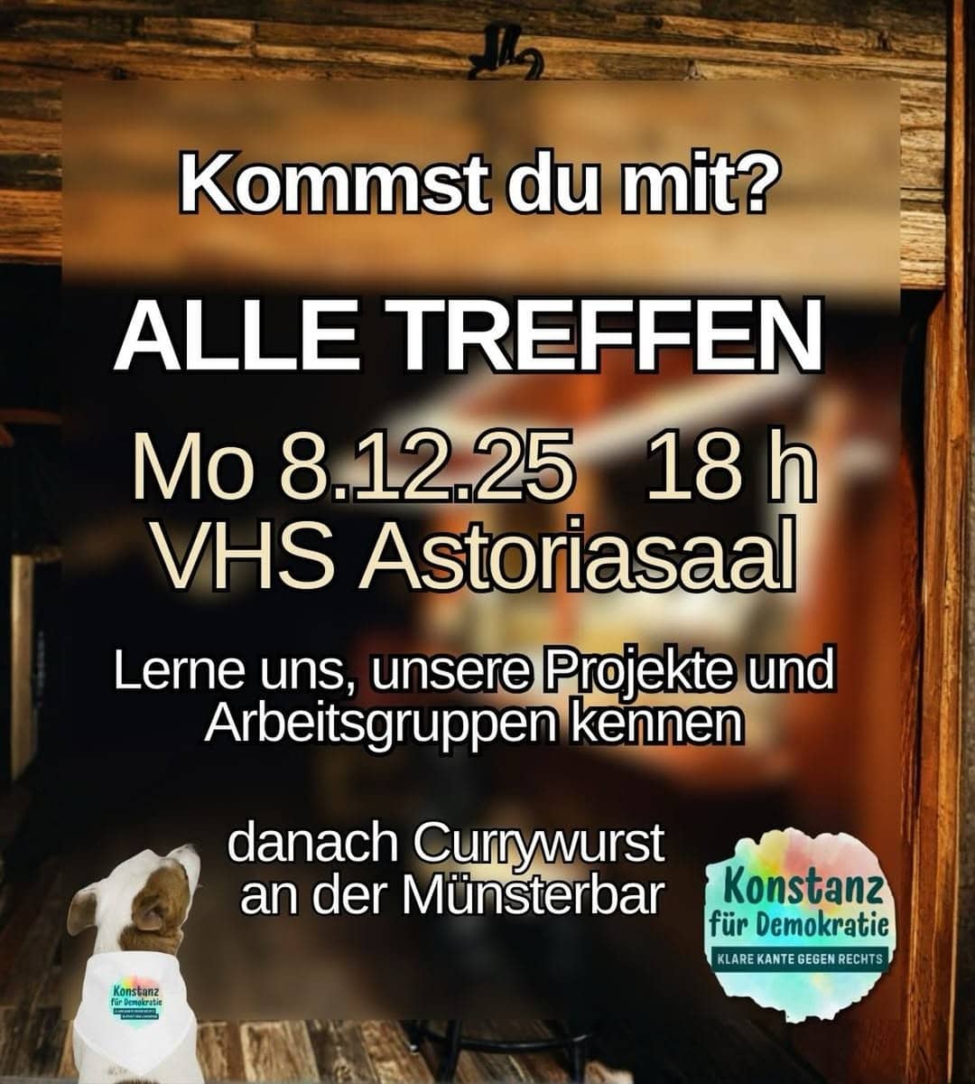 Wir treffen uns im Astoriasaal des Kulturzentrums Konstanz, Zugang über VHS Katzgasse 7. Danach ziehen wir weiter zur Münsterbar, die für einen guten Zweck leckere Currywurst, Glühwein und Likörchen verkauft.