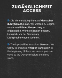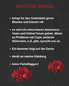 Wir beginnen mit einem Gedenkteil, bringt hierfür gerne Blumen und Kerzen mit. Es wird eine Auftakt- und Abschlusskundgebung mit starken Reden und Beiträgen geben. Die Demo selbst wird laut! Zieht euch warm an und bringt eure Liebsten mit!