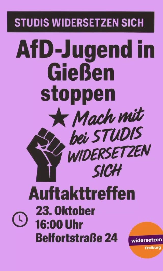 Am 29.11. widersetzen wir uns in Gießen, denn mit der geplanten Gründung von „Generation Deutschland“ will die AfD-Jugend neue rechte Strukturen aufbauen – wir stellen uns dagegen!
