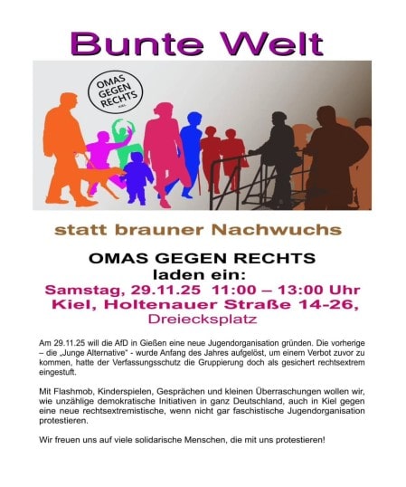 Mit Flashmob, Kinderspielen, Gesprächen und kleinen Überraschungen wollen wir, wie unzählige demokratische Initiativen in ganz Deutschland, auch in Kiel gegeneine neue rechtsextremistische, wenn nicht gar faschistische Jugendorganisation protestieren.