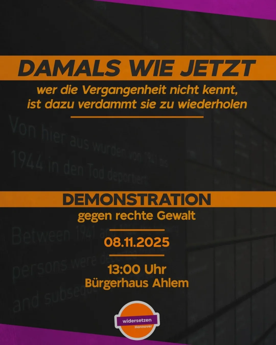 wie schon letztes Jahr planen wir von widersetzen eine Demonstration gegen rechte Gewalt anlässlich des Jahrestags des rassistischen und antisemitischen Anschlags am 08. November auf die Gedenkstätte in Ahlem.