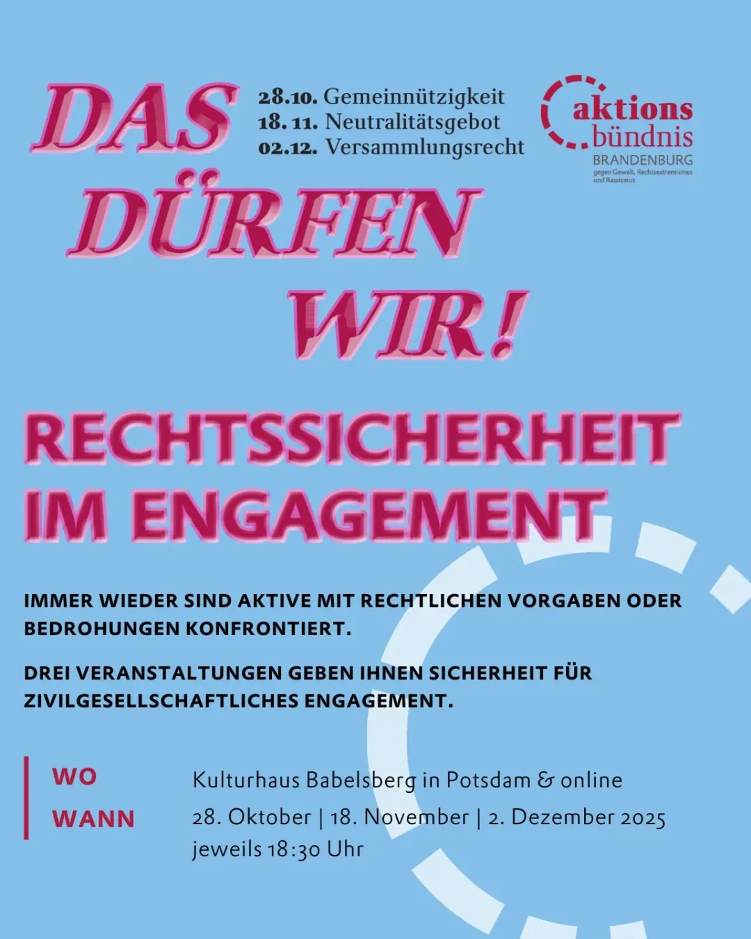 Immer wieder wird die demokratische Zivilgesellschaft von rechts angefeindet – dazu gehören etwa die Infragestellung der Gemeinnützigkeit von Vereinen oder der Vorwurf, politische Äußerungen verletzten das Neutralitätsgebot. So wird versucht, Engagierte einzuschüchtern und sich unliebsamer Kritik zu entledigen. Wissen stärkt gegen solche Bedrohungen. Das Aktionsbündnis Brandenburg lädt daher zu einer Veranstaltungsreihe darüber ein, was wir alles dürfen: kritisieren, demonstrieren, für Demokratie und Menschenrechte streiten.