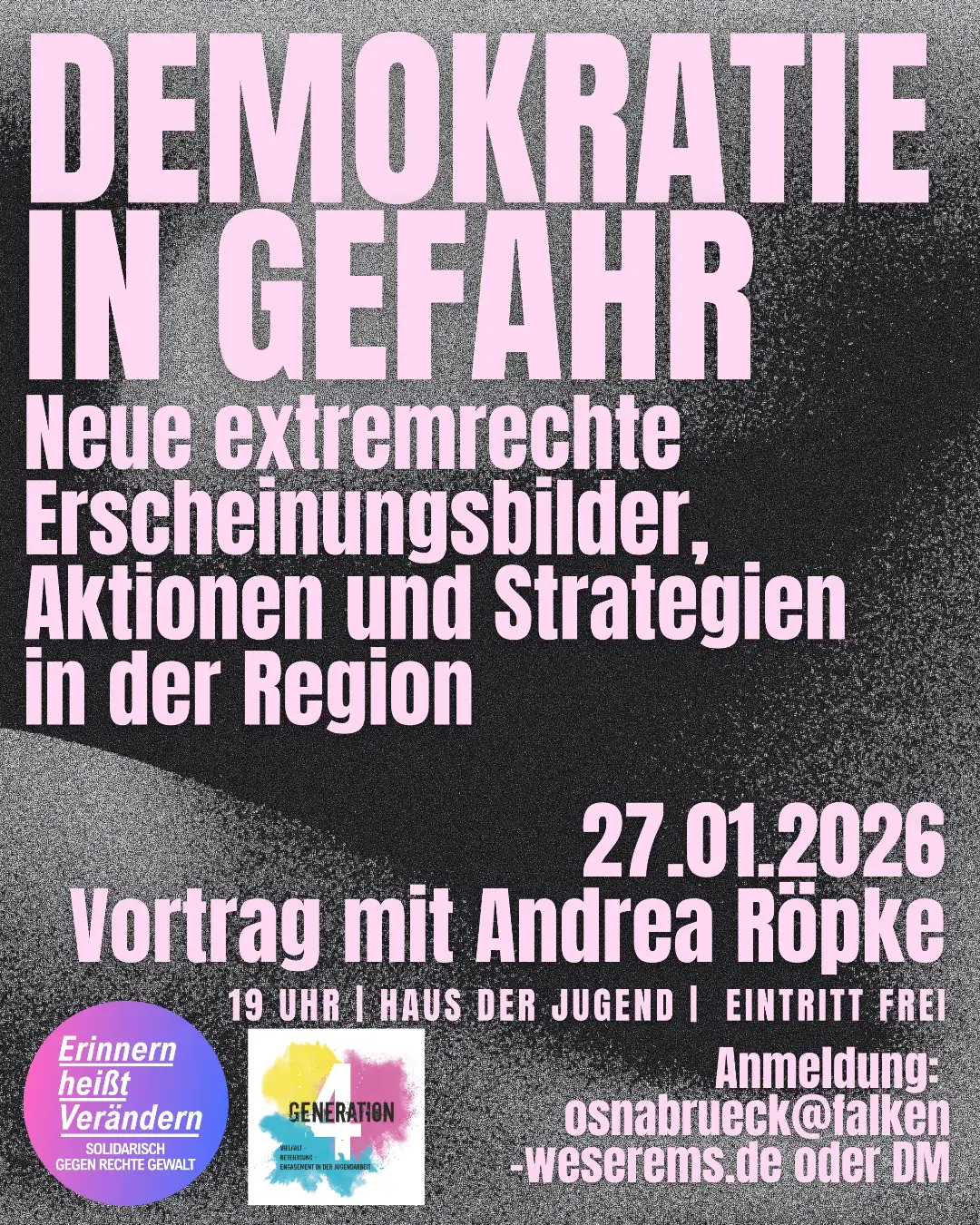 Die Rechtsextremismus-Expertin und Buchautorin Andrea Röpke, Politologin und freie Journalistin mit dem Spezialgebiet Rechtsextremismus, liefert uns hierzu wichtiges Hintergrundwissen – mit besonderem Fokus auf deren Aktivitäten und Netzwerke in der Region. Sie thematisiert dabei, inwiefern von diesen Strukturen eine konkrete Gefahr für die demokratische Gesellschaft ausgeht. Im Anschluss an den Vortrag besteht die Möglichkeit für Fragen und eine gemeinsame Diskussion. Andrea Röpke führte aufwendige Inside-Recherchen im Neonazi-Milieu durch, die unter anderem im WDR und der taz veröffentlicht wurden. Zudem hat sie zahlreiche Bücher veröffentlicht. Für ihre engagierte Arbeit wurde sie mehrfach ausgezeichnet.