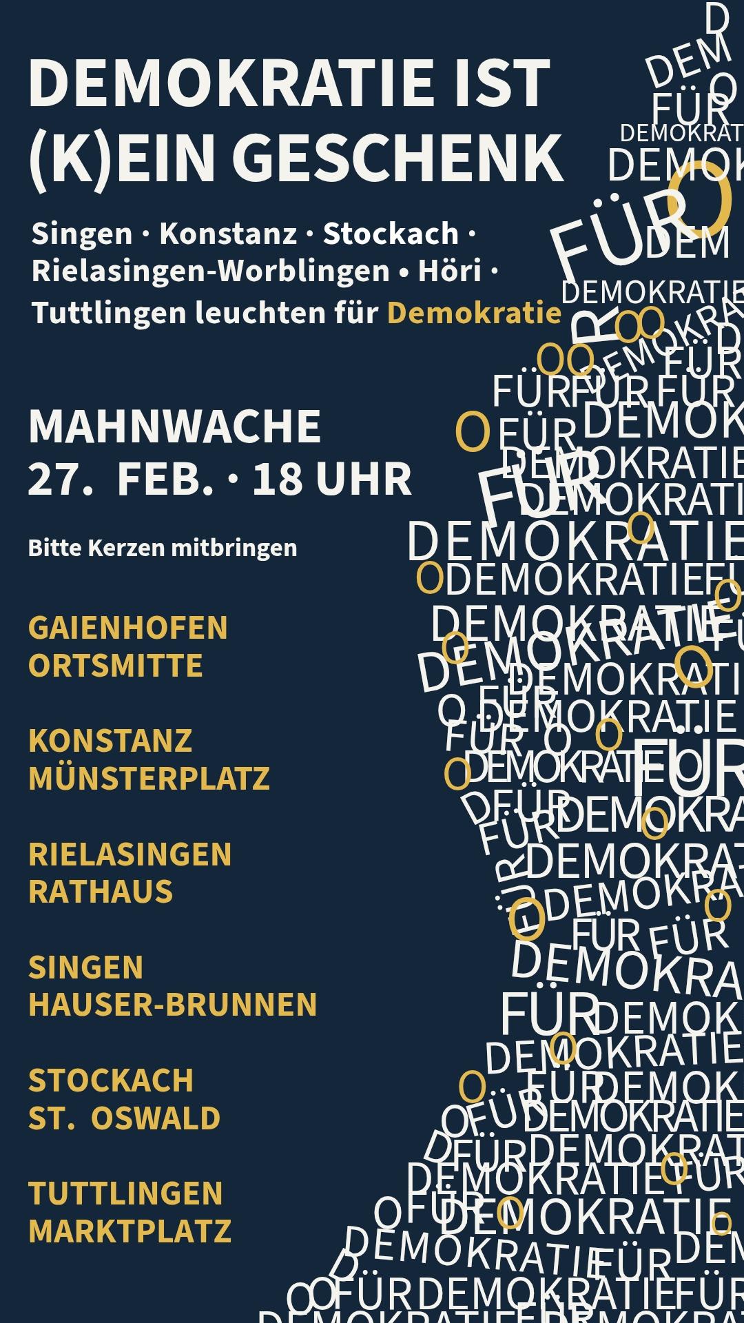 Am Freitag finden in Stockach, Gaienhofen, Rielasingen, Singen, Konstanz und Tuttlingen landkreisübergreifende Mahnwachen für Demokratie, Menschenwürde und Freiheit statt.