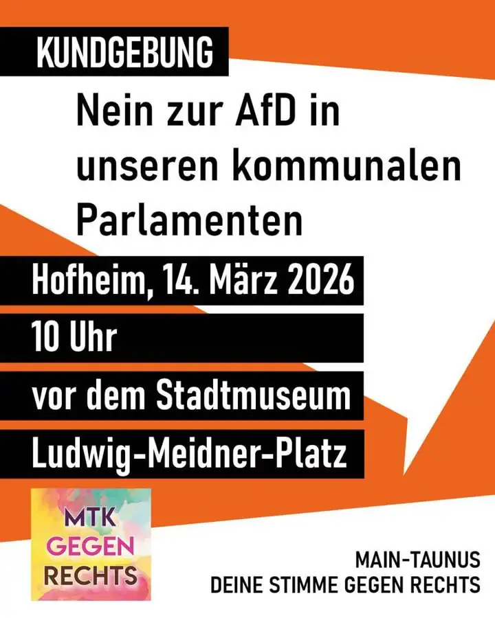 Bei der Kommunalwahl tritt die AfD erstmals auch zum Hofheimer Stadtparlament an. Das lassen wir nicht unkommentiert und stellen gemeinsam klar: Hier ist kein Platz für Rechtsextremismus! Wir wollen eine demokratische und solidarische Gesellschaft für alle!