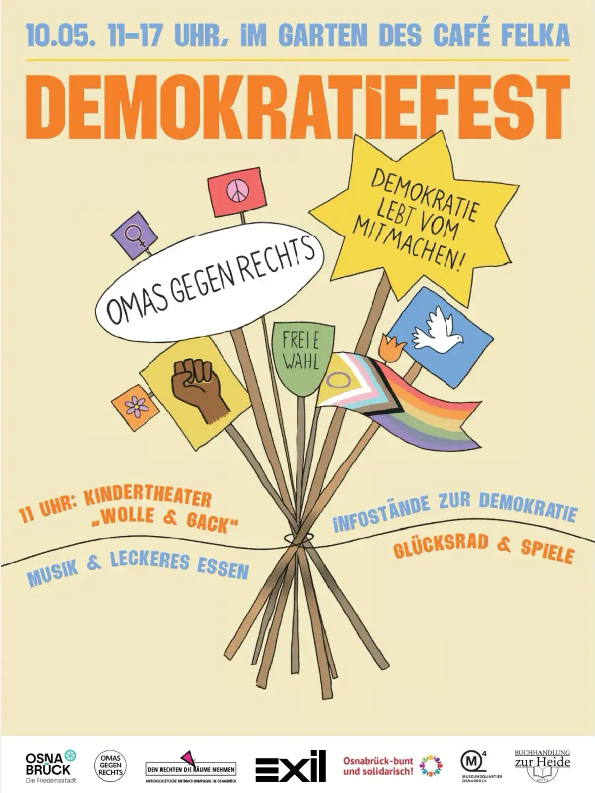 Wir freuen uns, dass wir dieses Fest mit der Unterstützung zahlreicher Initiativen aus Osnabrück in der schönen Umgebung des Café Felka und des Museumsquartiers feiern können. Einen besonderen Dank richten wir dabei an den Verein Exil.