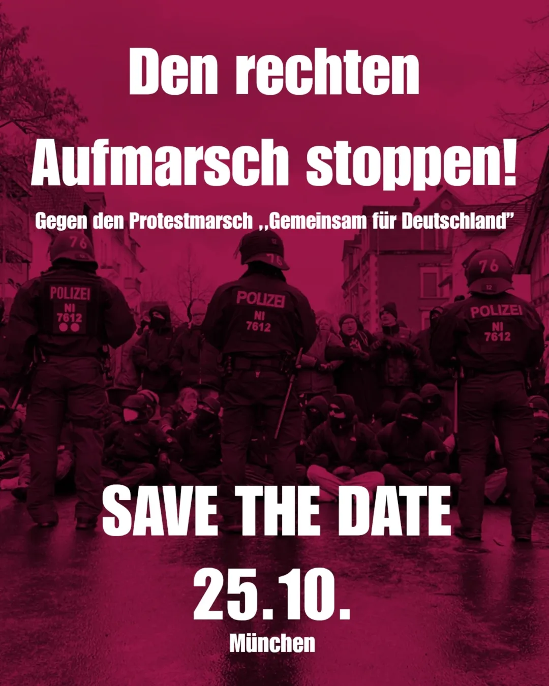 Wie auch die letzten Male fordern sie den “Schutz der Bevölkerung”. Das klingt zunächst nach einer bessern Sicherheitspolitik, doch dahinter steht ein rassistisches Gedankengut. Die Aussagen dienen dazu, Angst vor Geflüchteten oder Migrant:innen zu schüren. Wir werden nicht einfach zuschauen wie “Gemeinsam für Deutschland” einen regelmäßig stattfindenden rechten Protest in München veranstaltet.