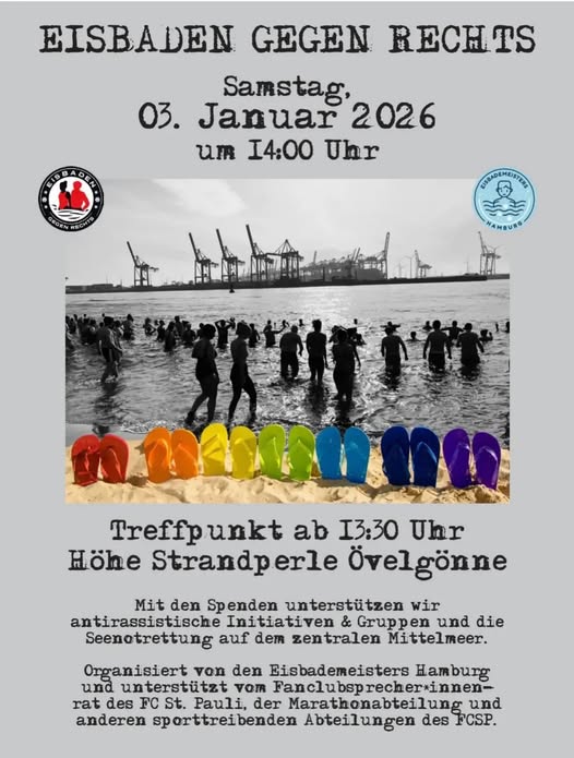 Mit den Spenden unterstützen wir antirassistische Initiativen & Gruppen und die Seenoatrettung auf dem zentralen Mittelmeer. Organisiert von den Eisbademeisters Hamburg und unterstützt vom Fanclubsprecherinnenrat des FC St. Pauli, der Marathonabteilung und anderen sporttreibenden Abteilungen des FC Sankt Pauli.