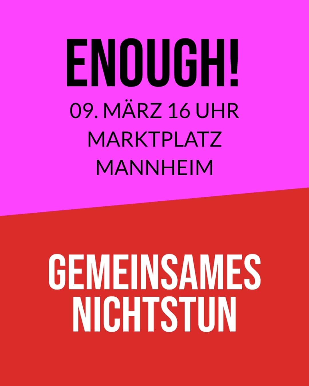Als Teil des globalen Frauenstreiks ruft die ENOUGH! Regionalgruppe Mannheim Frauen* am Mo, den 9. März, um 16 Uhr auf dem Marktplatz zum einstündigen Nichtstun auf. Frauen* sind eingeladen mitzumachen, in Pink oder Rot zu kommen und eine Sitzgelegenheit mitzubringen. Partei-Banner oder Nationalfahnen sind bei der Aktion nicht erwünscht. Da es sich nicht um einen tarifrechtlichen Streik handelt, müssen Einzelpersonen eigenverantwortlich entscheiden, wie sie sich freistellen, können den Tag aber auch Online oder mit Spenden unterstützen. Die Aktion reiht sich in viele andere Veranstaltungen unterschiedlicher Initiativen ein, darunter alle Aktionen der Plattform ENOUGH! mit ihren vielen Regionalgruppen, sowie in Mannheim die jährliche Demo zum Feministischen Kampftag am 8. März und eine Brülldemo der Mannheimer Gruppe des Töchter Kollektivs am 9. März um 13 Uhr, die ebenfalls auf dem Marktplatz stattfindet. Alle, die nicht Ort mitmachen können, sind eingeladen, sich mit einem einem digitalen Solokit zu beteiligen. Zu den jeweiligen Punkten folgen gesonderte Posts.
