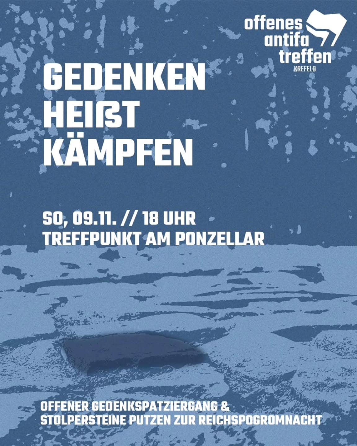 Am 09.11., Jahrestag der Pogromnacht wollen wir gemeinsam den Opfern des deutschen Faschismus mit einem Spaziergang durch die Krefelder Innenstadt gedenken.