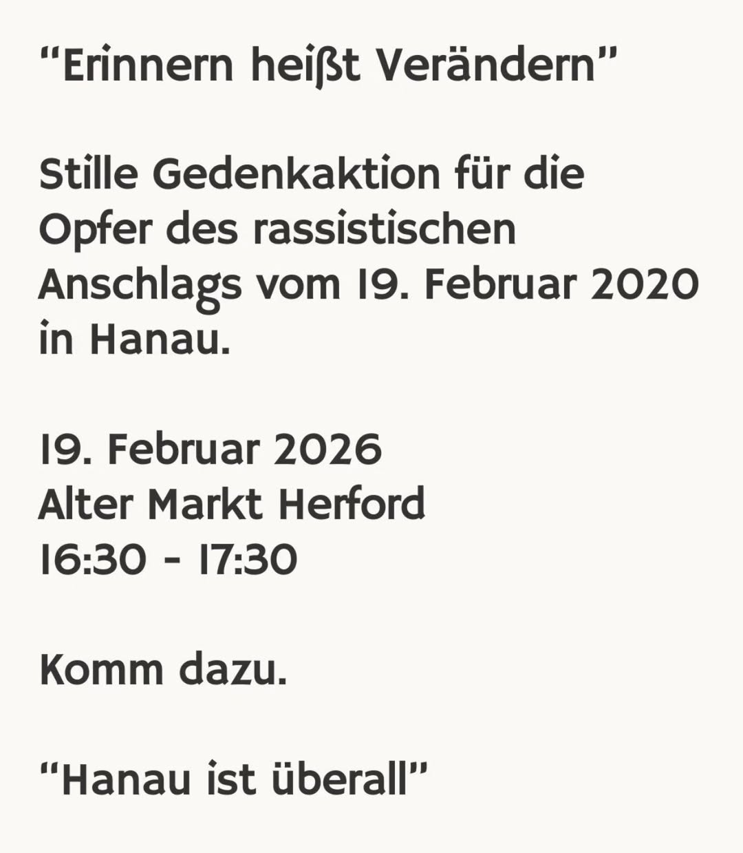 Am 19. Februar 2026 sind die Gedanken der OMAS GEGEN RECHTS Herford ganz besonders bei Ferhat Unvar, Hamza Kurtović, Said Nesar Hashemi, Vili Viorel Păun, Mercedes Kierpacz, Kaloyan Velkov, Fatih Saraçoğlu, Sedat Gürbüz und Gökhan Gültekin.