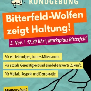 Am 01.09.2025, ab 17 Uhr, wollen wir auf dem Marktplatz in Bitterfeld gegen die AfD demonstrieren. Mit Redebeiträgen und Musik wollen wir gemeinsam den Nazis widersprechen.