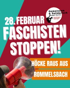 Unsere Gesellschaft lebt von Respekt, Meinungsvielfalt und demokratischen Werten. Diese geraten zunehmend unter Druck durch polarisierende Akteure, die die Grenzen des Sagbaren verschieben. Mit dem Faschisten Bjorn Höcke, Maximilian Gerner und weiteren AfD-Akteuren kommt eine Politik nach Rommelsbach, die für Ausgrenzung, völkisches Denken und gesellschaftliche Spaltung steht.