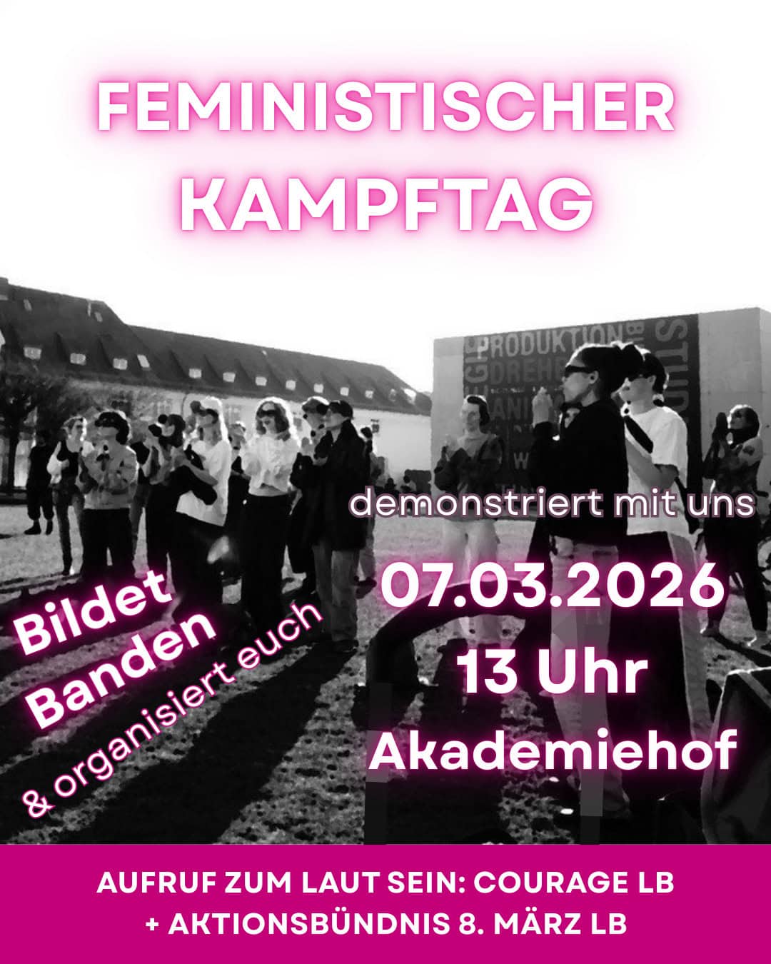Bildet Banden – Organisiert euch: Unter diesem Motto wollen wir mit euch gemeinsam durch die Ludwigsburger Innenstadt ziehen. Wir starten auf dem Akademiehof sind zusammen laut und wütend.