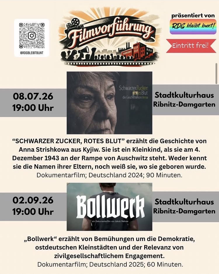 Das Bündnis „RDG bleibt bunt!“ lädt zu zwei besonderen Dokumentarfilmen ins Stadtkulturhaus Ribnitz-Damgarten ein. Beide Filme erzählen auf unterschiedliche Weise von Geschichte, Verantwortung und dem Einsatz für Demokratie.