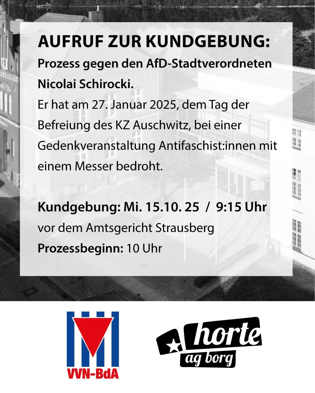Am Mittwoch beginnt der Prozess am Amtsgericht Strausberg gegen den Strausberg AfD-Stadtverordneten Nicolai Schirocki. Wir rufen alle Antifaschist:innen dazu auf, an unserer Kundgebung für ein AfD Verbot teilzunehmen und im Anschluss den Prozess zu besuchen.