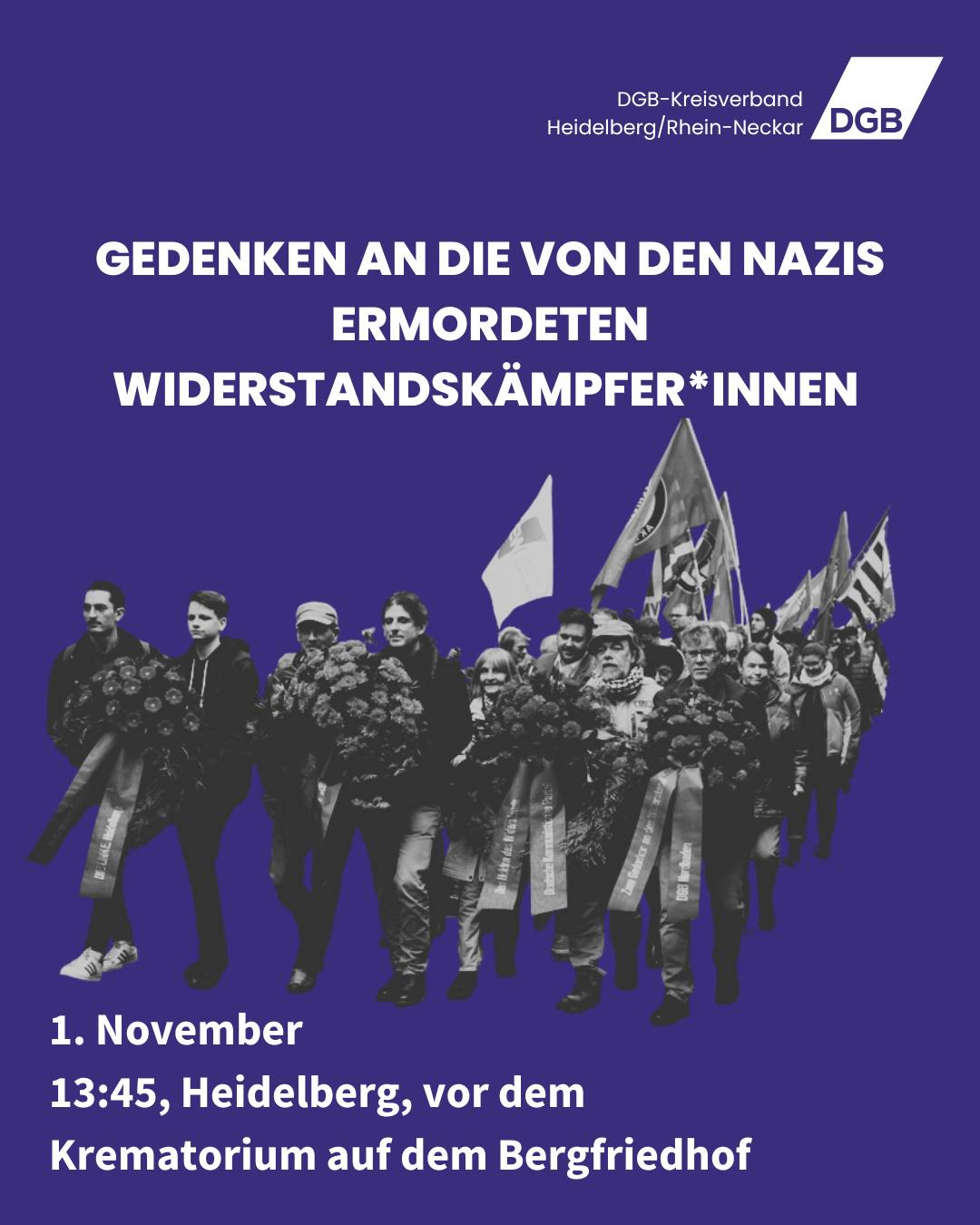 Wie jedes Jahr am 1. November ruft die VVN-BdA Heidelberg zusammen mit dem DGB Heidelberg/Rhein-Neckar zum Gedenken am Mahnmal für die von den Nazis ermordeten Widerstandskämpfer*innen auf dem Bergfriedhof auf.