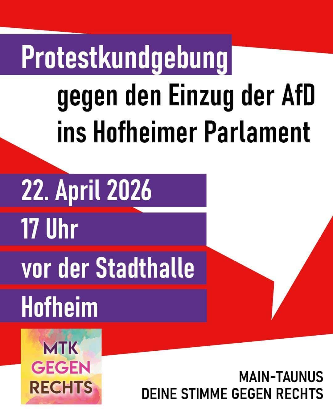 Wir sind alarmiert darüber, dass erstmals seit 1945 wieder eine im Kern rechtsextreme Partei im Hofheimer Stadtparlament vertreten ist. Für den Abend der konstituierenden Sitzung der Stadtverordnetenversammlung haben wir daher eine Protestkundgebung gegen den Einzug der AfD angemeldet.
