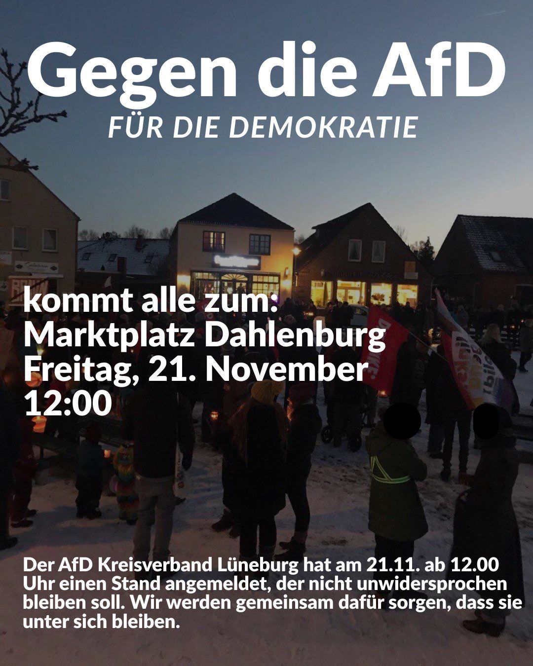 Der AfD Kreisverband Lüneburg hat Freitag einen Stand angemeldet, der nicht unwidersprochen bleiben soll. Wir werden gemeinsam dafür sorgen, dass sie unter sich bleiben.