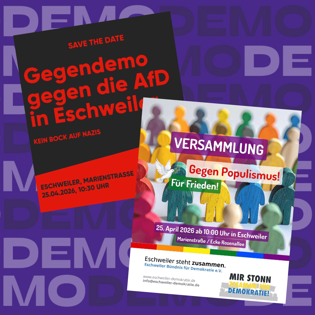 Gegen die Demonstration der AfD in Eschweiler werden für den kommenden Samstag nun Gegenproteste vom Eschweiler Bündnis für Demokratie und der Linksjugend Solid angekündigt.