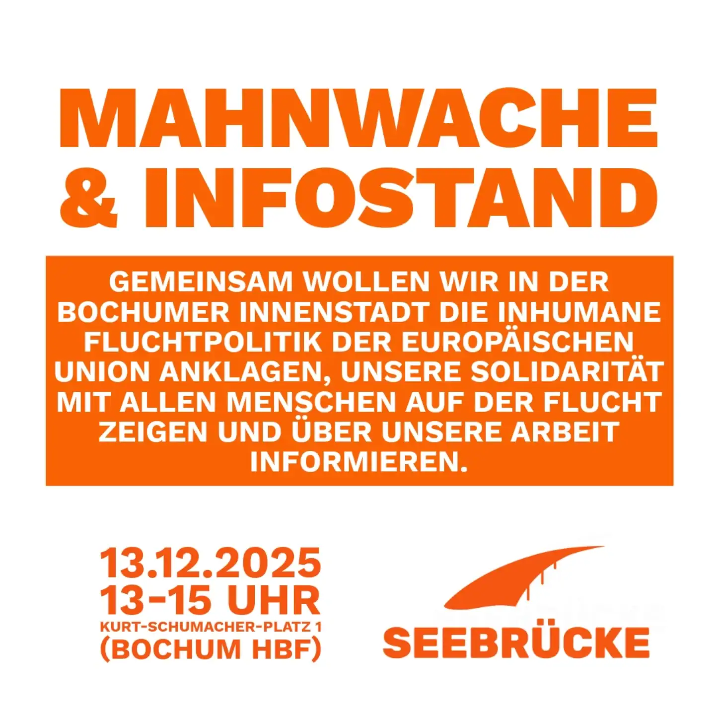 Gemeinsam wollen wir in der Bochumer Innenstadt die inhumane Fluchtpolitik der europäischen Union anklagen, unsere Solidarität mit allen Menschen auf der Flucht zeigen und über unsere Arbeit informieren!