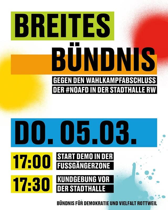 Das bedeutet für uns am Donnerstag, 5. März, drei Tage vor den Landtagswahlen, der #noafd in der Stadthalle in #Rottweil nicht unkommentiert zu lassen. Der Landesverband Baden-Württemberg plant eine große Veranstaltung im Rahmen seines Landtagswahlkampfs. Erwartet werden Markus Frohnmaier und „Bundesprominenz“.