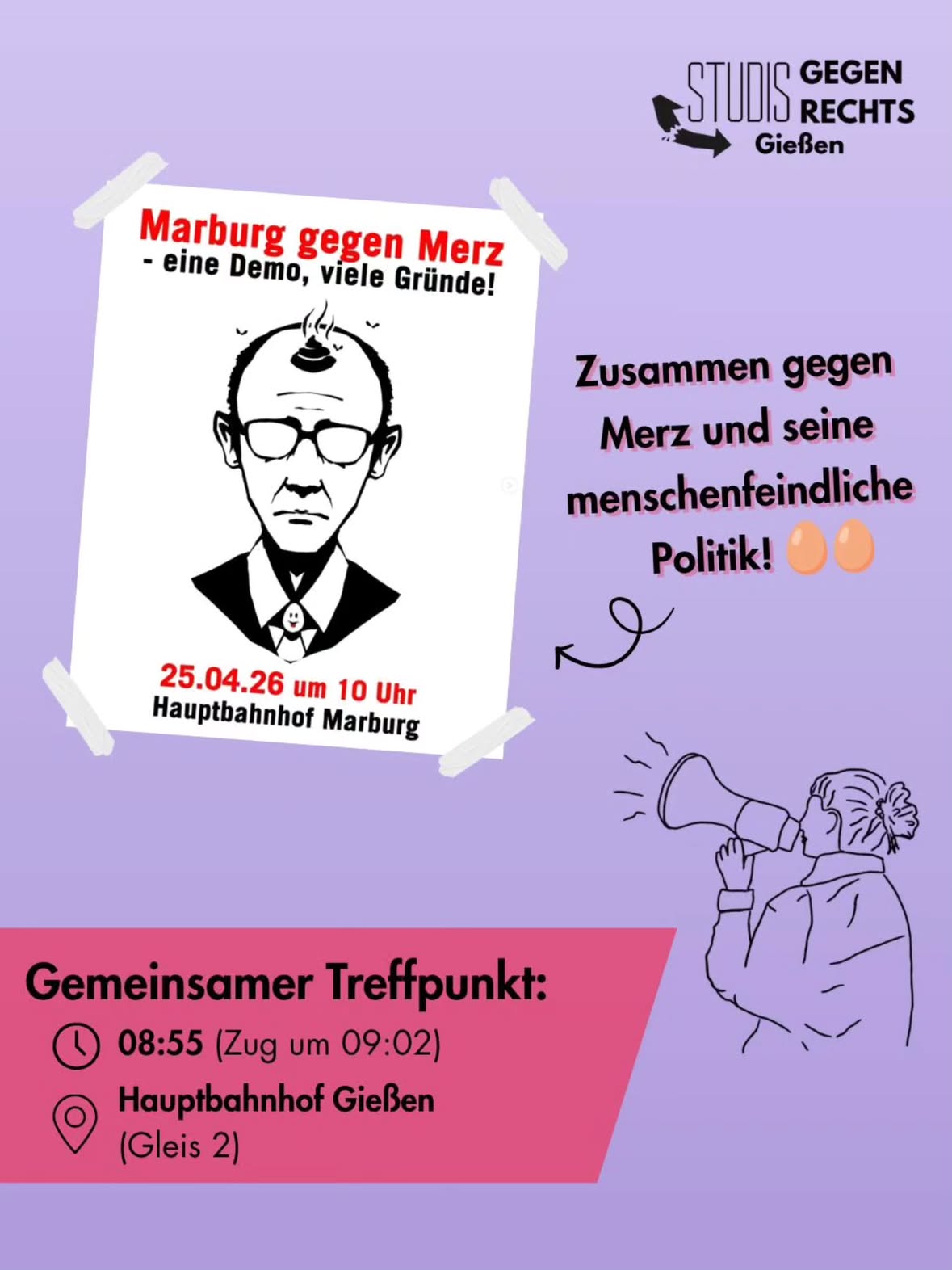 Deshalb lasst uns zusammen nach Marburg fahren, für eine solidarische Gesellschaft laut sein und Merz klar sagen, was wir von seiner Politik halten!