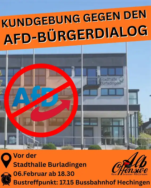Am Freitag soll in der Stadthalle in Burladingen ein so genannter AfD-Bürgerdialog mit dem AfD-Landtagsabgeordneten Hans-Peter Hörner, den AfD-Bundestagsabgeordneten Joachim Bloch und Stephan Brandner, sowie dem AfD-Kandidaten Alexander Gräff stattfinden. Der Thüringer Brandner gilt als enger Vertrauter des Faschisten Björn Höcke.