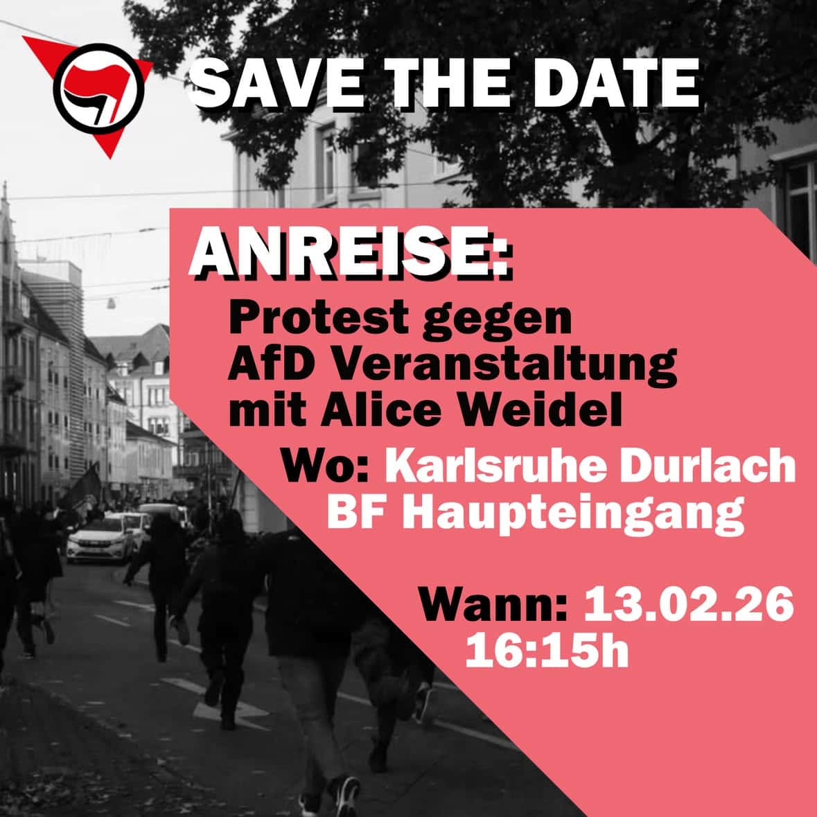 Am Freitag findet in Pforzheim eine Veranstaltung der AfD statt, zu der auch Alice Weidel kommen wird. Das wollen wir nicht unbeantwortet lassen. Deshalb fahren wir gemeinsam zum Gegenprotest um das OAT Pforzheim und die Initiative gegen Rechts zu unterstützen.