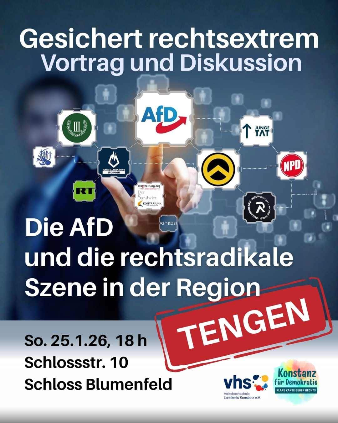 Das Bündnis und die vhs im Landkreis Konstanz kooperieren mit den Demokratie-Bündnissen in Singen, Radolfzell, Stockach und auf der Höri sowie mit dem Schloss Blumenfeld und der Zeller Kultur als weitere Veranstalter.