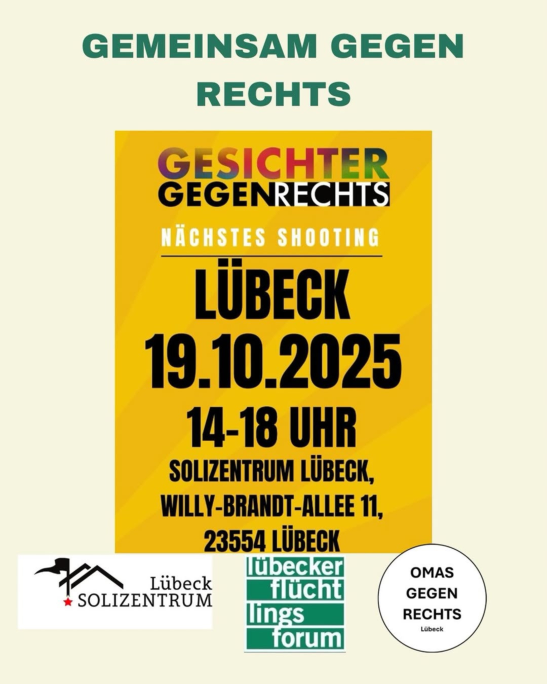 Gemeinsam mit den Omas Gegen rechts Lübeck setzen wir ein klares Zeichen gegen Rechts – mit Deinem Gesicht! Komm zu unserem Fotoshooting und werde Teil der Bewegung „Gesichter Gegen Rechts“. Gemeinsam zeigen wir Haltung und setzen ein starkes Statement für Vielfalt, Demokratie und Toleranz.