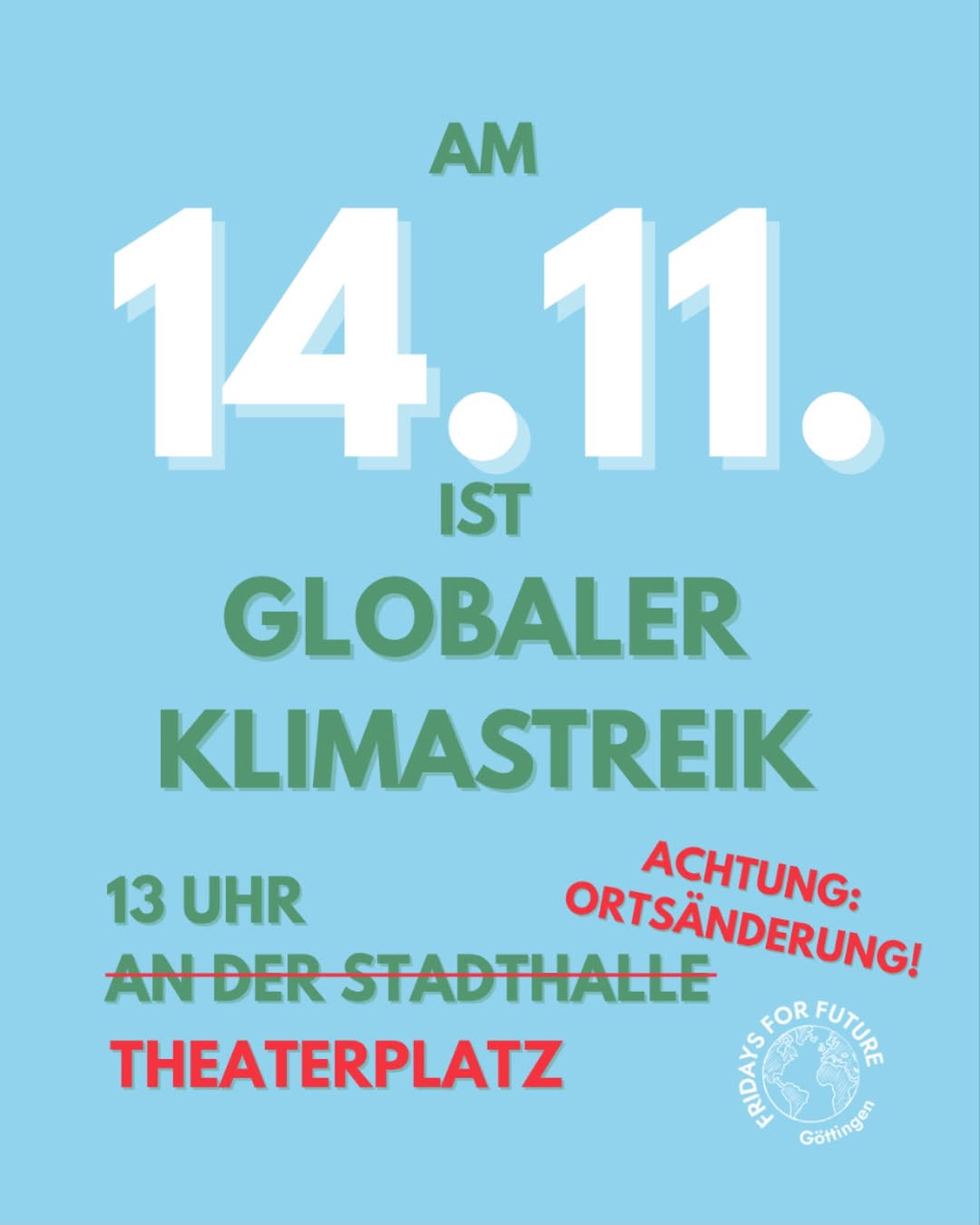 Wir haben keine Zeit mehr für leere Versprechen. Deshalb gehen wir am 14.11. weltweit und an unzähligen Orten in ganz Deutschland auf die Straße. Wir streiken – für echten Wandel, für internationale Solidarität und für eine Politik, die endlich handelt.