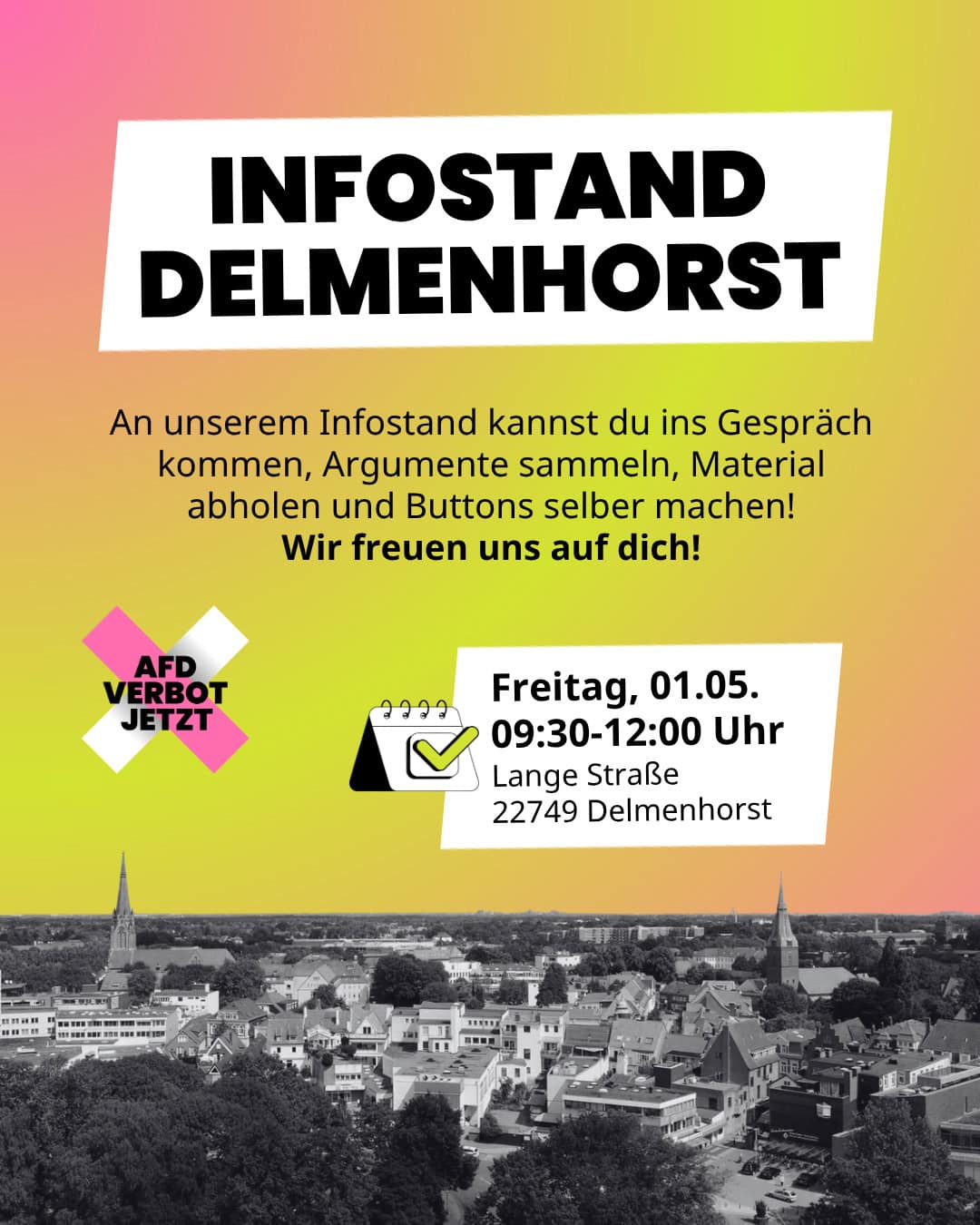 An unserem Infostand kannst du ins Gespräch kommen, Argumente sammeln, Material abholen und Buttons selber machen!