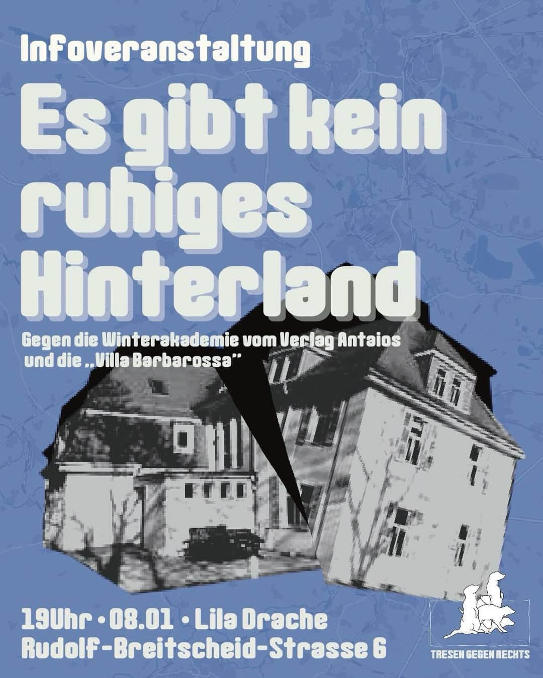 Am 25. Januar wollen wir gemeinsam erst gegen die Winterakademie vom Verlag Antaios in Schnellroda und direkt im Anschluss gegen die ,,Villa Barbarossa‘‘ protestieren. So schimpft sich das Haus der identitären Bewegung in Schkopau.