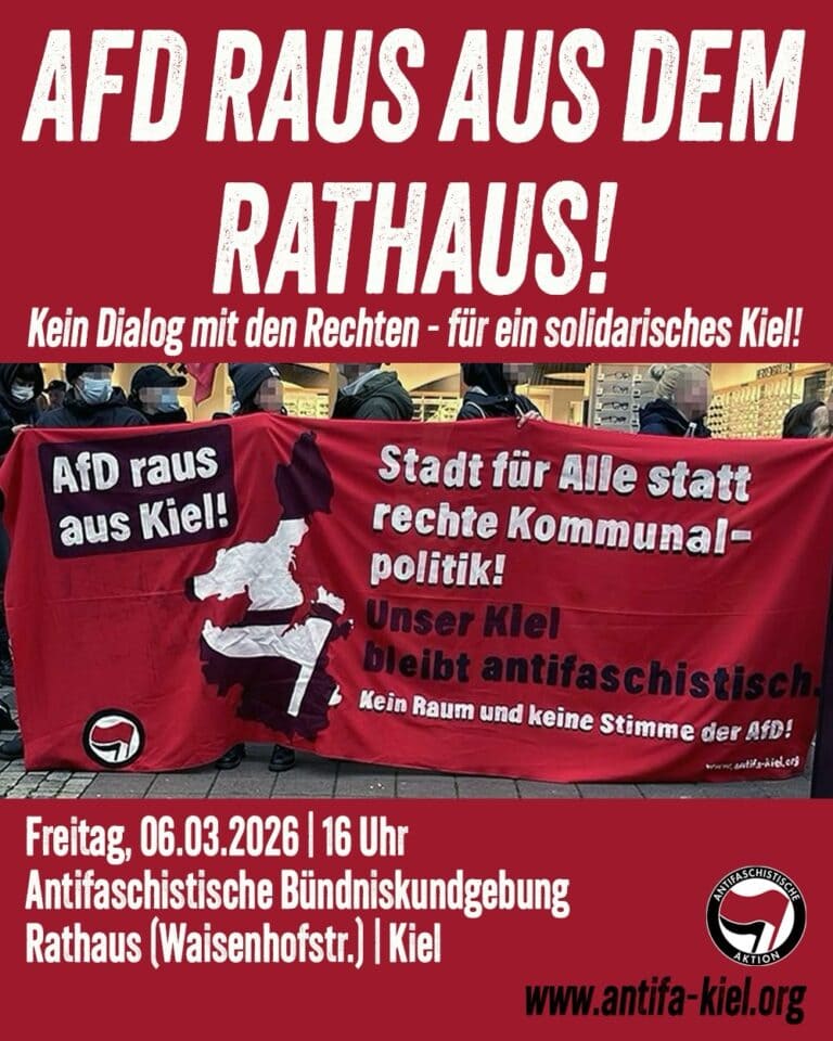 Für diesen Freitag stellt die Stadt Kiel abermals den Ratssaal ihres Rathauses für eine Veranstaltung der faschistischen AfD zur Verfügung. Die Kieler AfD-Ratsfraktion kündigt an, mit dem Landesvorsitzenden und Bundestagsabgeordneten Kurt Kleinschmidt das Für und Wider der städtischen Olympiabewerbung diskutieren zu wollen, über die die Kieler:innen am 19. April entscheiden sollen.