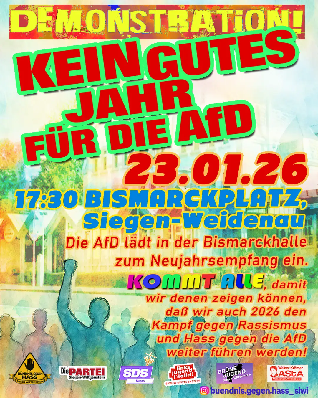 Mit unserer Gegenkundgebung soll deutlich gemacht werden, dass rechtspopulistische und demokratiefeindliche Positionen widersprochen wird. Das wird unser(!) Jahresauftakt zu diesem wir deutlich machen werden, dass auch 2026 wir uns nicht unterkriegen lassen.