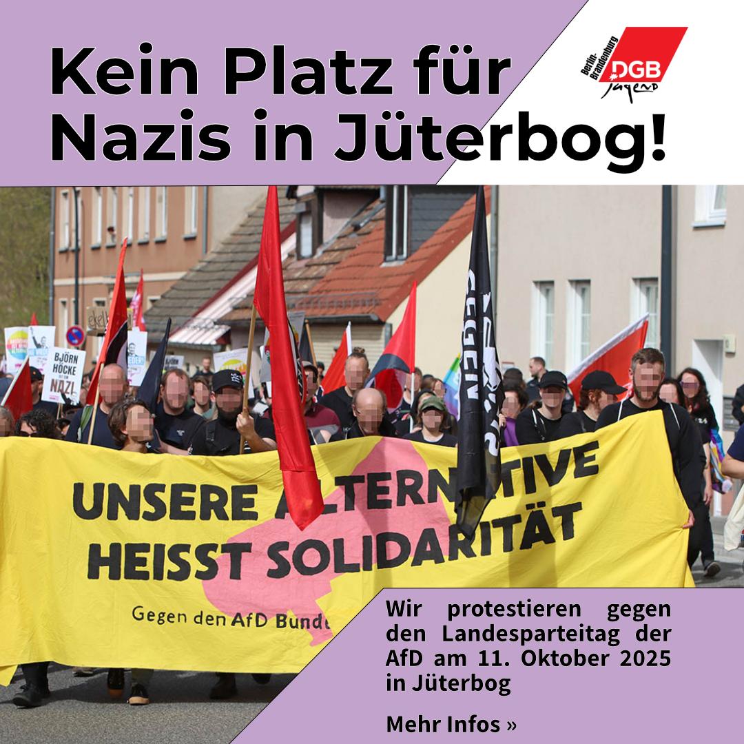 Kein Platz für Nazis in Jüterbog! Am Samstag wollen wir gemeinsam in Jüterbog ein starkes Zeichen setzen – gegen den Landesparteitag der AfD und gegen Hetze!