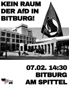 Die AfD möchte mit einer großen Veranstaltung in der Stadthalle Bitburg in die heiße Phase des Wahlkampfs für die Landtagswahl in Rheinland-Pfalz übergehen. Unter dem Motto “Bitburg wird blau” kommen an dem Tag verschiedene Hauptakteur*innen der rechten Bewegung in die Stadt. Trotz ihres Rassismus, Sexismus, Klassismus, Neoliberalismus, ihrer Queerfeindlichkeit etc. möchte die Partei sich als “Retterin” für von der Politik im Stich gelassene Menschen und als “normale” Partei darstellen.