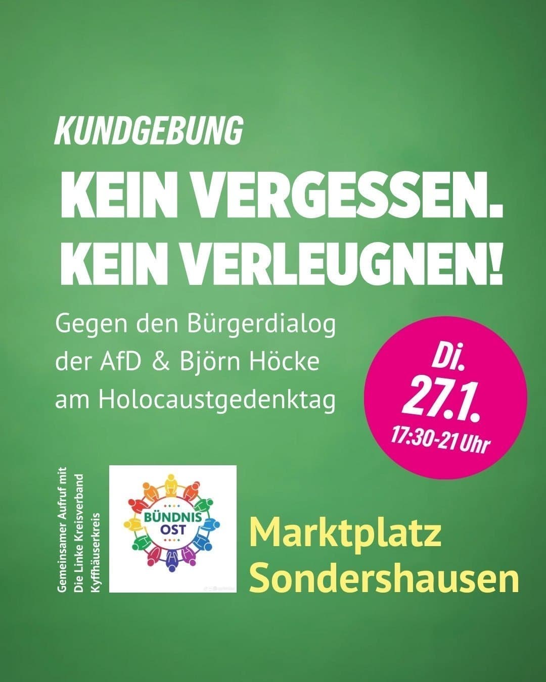 Am diesjährigen Holocaust-Gedenktag wird der Rechtsextremist und AfD-Landesvorsitzende Björn Höcke in Sondershausen, Kyffhäuserkreis, Thüringen einen Bürgerdialog veranstalten. Mitglieder seiner Partei relativieren regelmäßig den Holocaust oder verleugnen ihn sogar.