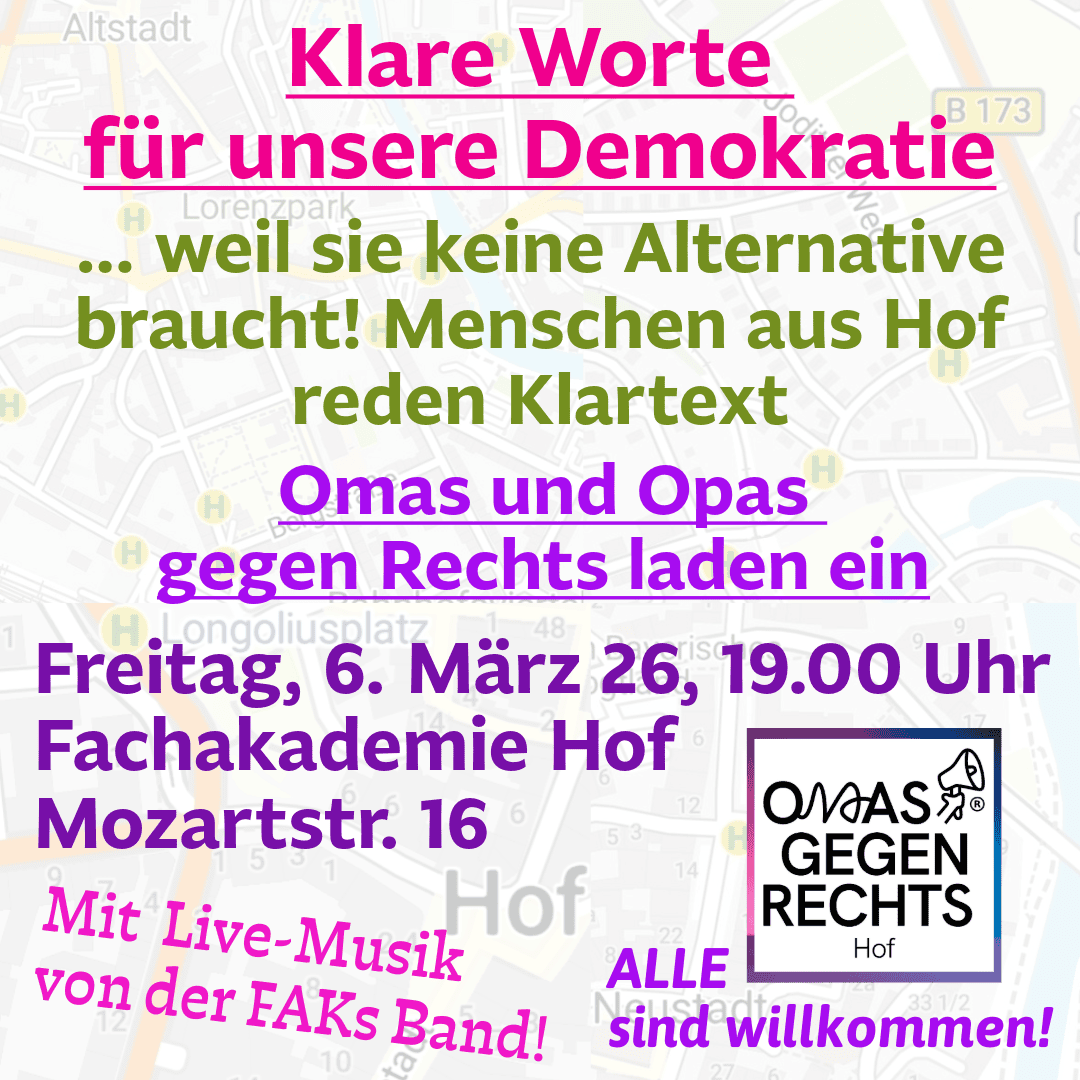 Klare Worte für unsere Demokratie….weil sie keine Alternative braucht! Menschen aus Hof reden Klartext, unterstützt mit Life-Musik von der FAKs Band