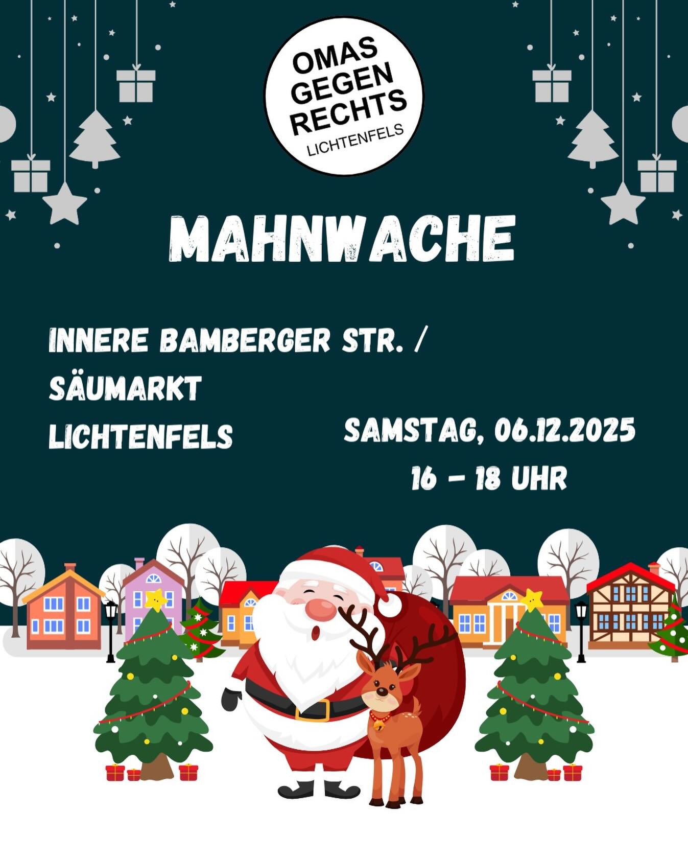 Die Omas gegen Rechts veranstalten erneut eine Mahnwache für Frieden, Toleranz und Stärkung unserer Demokratie . Diese findet am in der Inneren Bamberger Straße/Ecke Säumarkt statt.