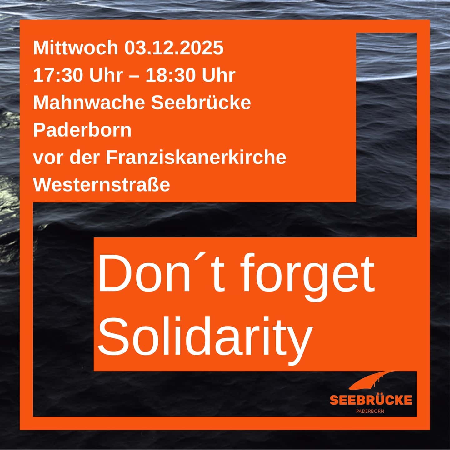 „Don´t forget Solidarity“ ist der Leitgedanke. Damit nimmt die Seebrücke Paderborn Stellung zu dem Versuch der Bundesregierung für das Jahr 2026 keine zusätzlichen Flüchtlinge aufzunehmen. Entsprechende Bemühungen innerhalb der EU sind zu Beginn des November bekannt geworden.