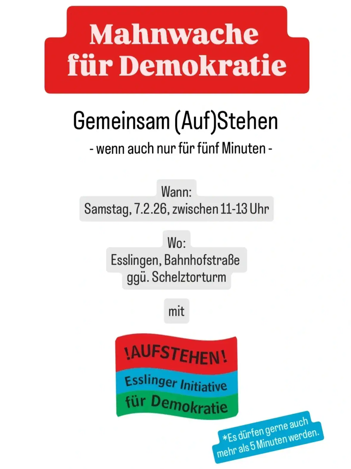 Bleibt, solange ihr wollt und könnt! Wer möchte, kann gerne ein Schild mitbringen oder sich einfach so dazu stellen.