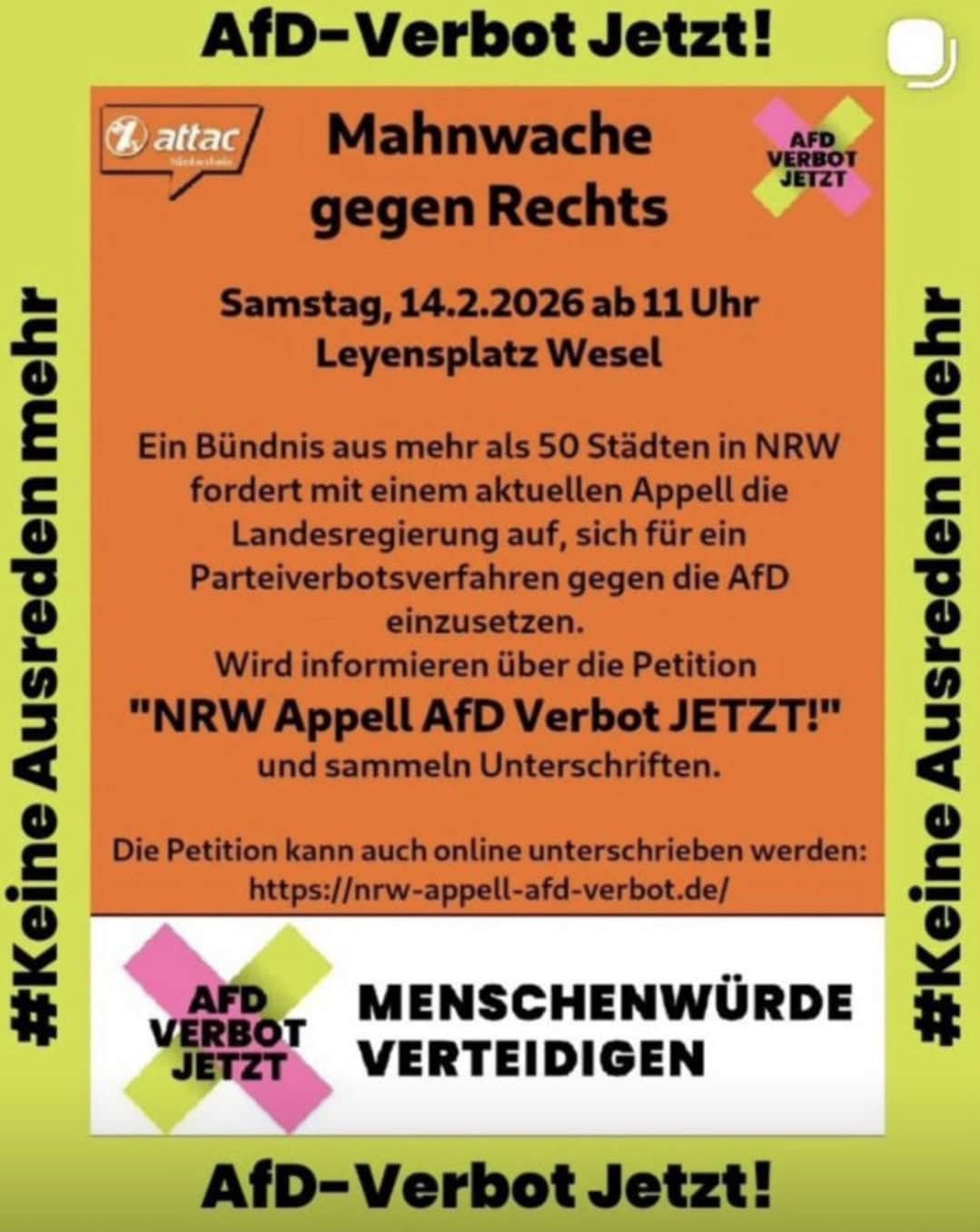Wird informieren über die Petition “NRW Appell AfD Verbot Jetzt!” und sammeln Unterschriften.